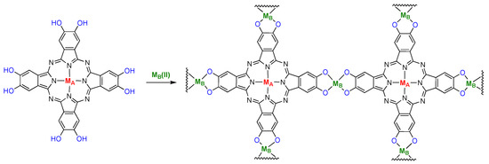 The aforementioned [72] materials featuring PcNi-linked via square-planar nickel(II) sites (MA = MB = Ni(II), Figure 10) were later used for the reduction of CO2 [74]. DFT calculations of the CO2-reducing system suggest that the Ni(II)-catecholate sites are not directly involved in CO2 activation; i.e., the PcNi sites are responsible for CO2 activation [74]. The Faradaic efficiency is about 98% for conversion of CO2 to CO and the turnover frequency was about 0.7 s−1.