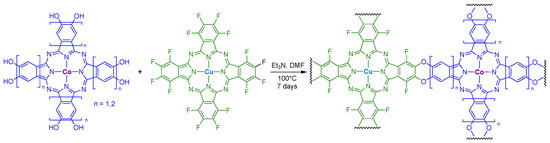 Two dioxin-linked COF materials were developed following the synthetic method in Figure 11 [75]. Here, a base-catalyzed nucleophilic aromatic substitution of perfluorinated PcCu and hydroxy-substituted PcCo gave rise to materials with variable pore sizes that were dictated by the size of the aromatic groups on PcCo. The best Faradaic efficiencies for the n = 1 and n = 2 materials were 91% and 97%, respectively. The corresponding turnover frequencies were 1.3 s−1 (n = 1) and 2.9 s−1 (n = 2) and the Tafel slopes near 120 mV per decade indicate that electron transfer is the rate limiting step in catalysis. In general, the complex with the larger pores and more conjugated π-system (i.e., n = 2, a naphthalocyanine core), showed better CO2 reduction characteristics.