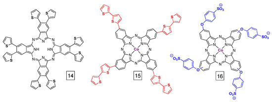 The previous sections focused on materials where PcM was non-specifically incorporated into solid supports or made up a structural portion of the material (i.e., COFs). Another class of PcM-derived materials includes polymers that are covalently modified with PcM, either as an added component post-polymerization or as a monomer. For example, one early example showed how polythiophene-based PcM could be prepared and polymerized (e.g., from 14 in Figure 12), but their activity toward CO2 reduction was not probed [82,83,84]. Recently, this idea was re-visited in the context of CO2 reduction using 15 (Figure 12) [85]. Compound 15 is readily electropolymerized on carbon paper or indium tin oxide-coated glass and the resulting polymers contain the expected ratios of Co and S derived from the molecular structures. A range of conditions and operating times were assayed; under ideal conditions (2 h electrolysis) the Faradaic efficiency was 94% and the turnover frequency was 0.3 s−1. Importantly, a 20 h electrolysis showed a ca. 30% decrease in turnover frequency (to 0.2 s−1) and about a 25% decrease in Faradaic efficiency (to 72%). As noted above for MOF and COF materials, the stability of this system is noteworthy, but the slow turnover is problematic and may be due to a large number of inactive sites. It may be advantageous to co-polymerize thiophene and 15 as a way to increase the dispersity of PcCo.