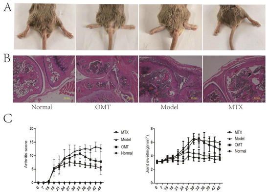 Two weeks after secondary immunization, swelling of the paws and ankle joints was observed in collagen-induced arthritis mice, with some joints showing deformities in the CIA model group (Figure 1A). Compared with the control group, the degree of joint swelling (Figure 1C) and arthritis score (Figure 1C) of mice in the CIA model group were significantly increased, and the joint swelling of mice after OMT intervention was reduced. In the CIA model group, there was a significant proliferation of the synovial layer, significant articular cartilage damage, and infiltration of a large number of inflammatory cells in the articular cavity. The degree of inflammatory cell infiltration was significantly decreased in the OMT group and methotrexate group (Figure 1B).