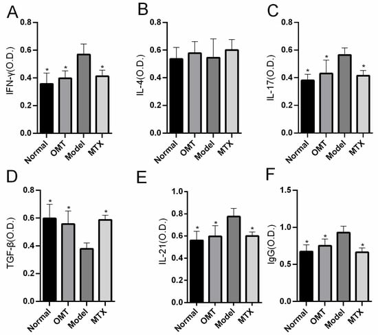 The effects of OMT on serum concentrations of (A) IFN-γ, (B) IL-4, (C) IL-17, (D) TGF-β, (E) IL-21, and (F) IgG. Data are expressed using mean ± SD. * p < 0.05 vs. the Model group.
