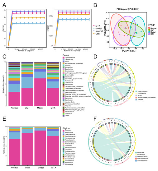 To study the regulation of OMT on the composition of gut microbiota in CIA mice, 16S rDNA gene sequencing was performed. According to the results of the Shannon and Simpson indices, the abundance of bacterial species in the CIA model group was lower than that in the normal group of mice, while the abundance of bacterial species in the OMT group and MTX group was higher than in the CIA model group (Figure 3A). The PCoA results showed a significant separation between the normal group, model group, MTX, and OMT groups (Figure 3B). Cluster analysis showed that the distance from the normal group to the OMT and MTX groups was shorter than the distance from the normal group to the model group. At the phylum level, Firmicutes and Bacteroides were the most abundant phylum among all samples (Figure 3E,F). In the model group, Firmicutes were higher than those in the control group, whereas Bacteroidota, Patescibacteria, and Campylobacterota were lower than those in the normal control group. OMT intervention reduced the abundance of Firmicutes and increased the abundance of Bacteroidota, Patescibacteria, and Campylobacterota. At the genus level, OMT decreased the abundance of g_Ligilactobacillus (Figure 3C,D).