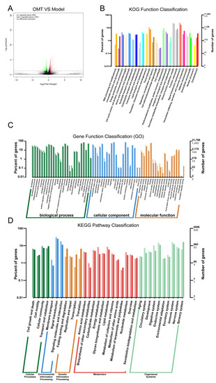 Transcriptomic analysis between the model and the OMT group. (A) Volcano map of differentially expressed genes (deg) between the two groups. (B) KOG enrichment analysis of differentially expressed genes. (C) GO enrichment analysis of differentially expressed genes. (D) KEGG enrichment analysis of differentially expressed genes.