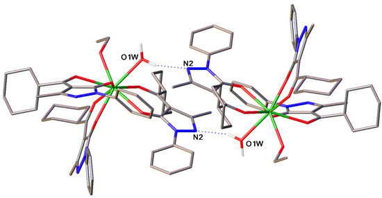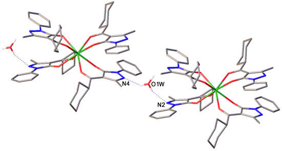 The structure is a mononuclear complex (See Figure 1), where the lanthanide ion is coordinated by oxygen atoms of three ligands (O1–O6) and two oxygen atoms of solvate molecules (O7 of ethanol and O1W of water), leading to the octa-coordinated complex with the coordination polyhedron {SmO8} which is best described as a square antiprism. Additionally, the structure contains one solvated molecule of ethanol, which is involved in hydrogen bonding with the water molecule (O1W…O1S distance is 2.70 Å). Upon further analysis of the crystal packing, the presence of intermolecular hydrogen bonds between the water molecule and pyrazole fragment of the adjacent molecule of the complex (O1W…N2 distance is 2.83 Å) was revealed, leading to the formation of hydrogen-bonded centrosymmetric dimers (See Figure 2).