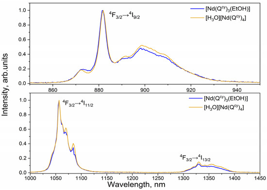 The photoluminescence spectra of [Nd(Qcy)3(H2O)(EtOH)]∙(EtOH) and [H3O][Nd(Qcy)4] complexes are shown in Figure 8. The typical spectral bands for Nd3+ ions are observed in the spectra:. The emission bands related to and electronic transitions are split by several Stark components centered at the same wavelengths for both the compounds. Therefore, there is no coordination polyhedron symmetry difference for these complexes.