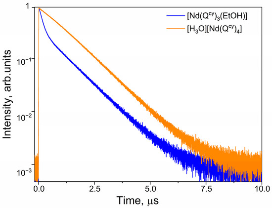 Photoluminescence decays for [Nd(Qcy)3(H2O)(EtOH)]∙(EtOH) and [H3O][Nd(Qcy)4] complexes, with the registration wavelength of 1056 nm, are shown in Figure 12. The tris complex has biexponentially fitted decay with characteristic lifetimes ns and ns. The tetrakis complex has monoexponential behaviour, and its characteristic lifetime is ns.