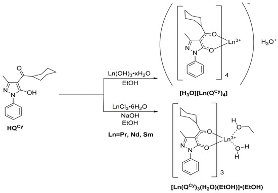 Single-crystal X-ray diffraction analysis of [Ln(Qcy)3(H2O)(EtOH)]∙(EtOH) (Ln = Sm, Pr, Nd) was carried out on a Bruker D8 Venture diffractometer (MoKα radiation, ω and φ-scan mode), and SCXRD analysis of (H3O)+[Ln(Qcy)4]− (Ln = Sm, Pr, Nd) was carried out on a Bruker D8 Quest diffractometer (MoKα radiation, ω and φ-scan mode). The structures were solved with direct methods and refined using the least-squares method in the full-matrix anisotropic approximation on F2. All hydrogen atoms were located in calculated positions and refined within a riding model. All calculations were performed using the SHELXTL [53,54] and Olex2 [55] software packages. Atomic coordinates, bond lengths, angles, and thermal parameters have been deposited at the Cambridge Crystallographic Data Centre with deposition numbers—CCDC 2280580-2280585, which are available free of charge at www.ccdc.cam.ac.uk (accessed on 13 July 2023).