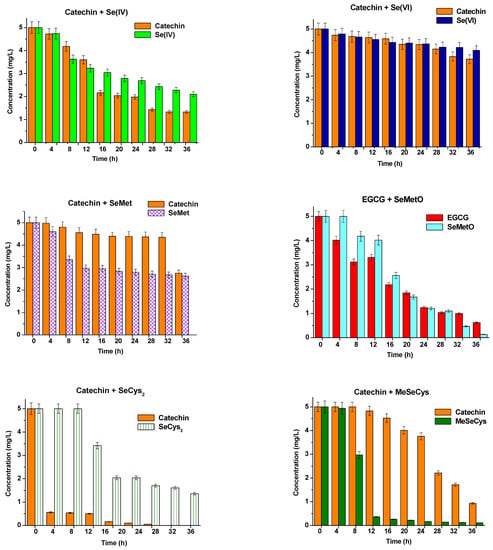 The mixtures of the main catechins (catechin, epicatechin, and EGCG) at a concentration of 5.00 mg L−1 and selenium standard compounds such as Se(IV), Se(VI), selenomethionine (SeMet), selenomethionine oxide (SeMetO), selenocystine (SeCys2), and metyloselenocysteine (MeSeCys) at the same concentration were prepared in water. The concentrations of the mixture components were determined by HPLC after every 4 h. Each sample was analyzed in triplicate, and the results expressed as a mean ± standard deviation are presented in Figure 1, Figure 2 and Figure 3. Between subsequent analyses, the studied binary mixtures were stored at room temperature and protected from light.