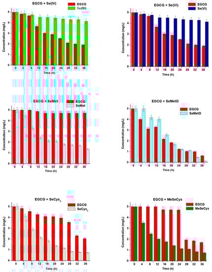 The changes in the concentrations of EGCG and selenium species vs. time of their mixing. The results are expressed as a mean ± sd, n = 3.