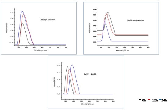 The UV–Vis spectra of the binary mixtures containing Se(IV) and studied catechins recorded at various time intervals are present in Figure 5. It can be seen that with increasing mixing time, the location of the maximum absorbance peak was shifted a little toward longer wavelengths. That suggests that SeNPs changed their dimensions, probably by aggregation. The exception is the solution containing epicatechin and Se(IV), where this relation is reversed. Moreover, only for this mixture, a decrease in signal intensity was observed. Despite these differences, it can be supposed that the suspension of SeNPs with a diameter in the range of 100–120 nm is formed. For the mixtures of catechins with other selenium species, these characteristic peaks were not observed under studied conditions.