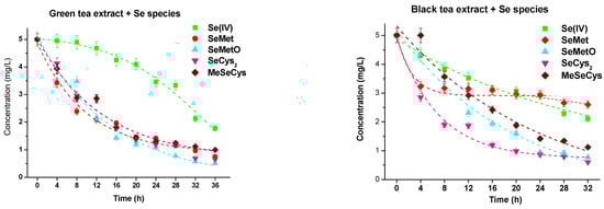 In the presence of both used tea infusions, the concentrations of selenium species decreased. This is particularly visible in green tea, where all selenium species, except selenites, gradually decreased during a prolonged time of their mixing. The concentration of Se(IV) was reduced much slower. The observed behavior of SeMetO, SeCys2, and MeSeCys is similar to that observed for their standard solutions alone (Figure 4).