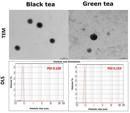 In order to accurately determine the shape and size of the nanoparticles, they were subjected to DLS and TEM analysis (Figure 8). TEM analysis revealed that the nanoparticles are spherical in all cases. Moreover, previously obtained results regarding the size of SeNPs were confirmed and clarified. Those from black tea have about 89.0 ± 3.2 nm, and those from green tea have a size of 101.5 ± 4.2 nm. It can, therefore, be concluded that the nanoparticles obtained in black tea are capable of crossing the cell membrane and thus can potentially be used in medicine. The results obtained by the DLS method suggested that the SeNPs obtained are about 100 nm. Additionally, the polydispersity index (PDI), which is a measure of the heterogeneity of a sample based on size, was significantly higher for the SeNPs obtained in green tea. This means that the particles are differentiated in terms of size. In the case of SeNPs obtained in black tea, the PDI value was 0.109. According to the theory, if the coefficient is less than 0.100, the particle fraction can be considered homogeneous. Certainly, the SeNPs obtained in black tea are significantly more homogeneous than those from green tea.