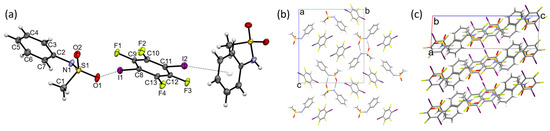 The BSA-14DITFB (2:1) co-crystal, 4, crystallises in a monoclinic space group P21/c with BSA and 14DITFB in a 2:1 ratio (Figure 4a). The BSA builds a 2D net pattern in the ab-plane using strong and weak HBs. Chains are based on strong O···H-N HB (d(O1···H1) = 2.08(3) Å; d(O1···N1) = 2.864(2) Å). These chains are interacting via weak O···H-C HB (d(O2···H5) = 2.62(2) Å; d(O2···C5) = 3.409(2) Å). The 14DITFB interacts with the π-systems linking the nets via XB. This XB is the shortest X···cg interaction presented in this publication, with a distance of 3.461 Å. The angle towards the centre of the aromatic system is ∢(C13-I1···cg) = 162.1°.