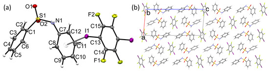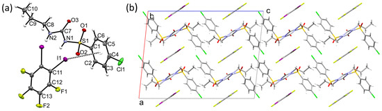 The CPA-1,4DITFB (2:1) co-crystal, 5, crystallises in a monoclinic space group, P21/n, with CPA and 14DITFB in a 2:1 ratio (Figure 5a). The strongest intermolecular interaction within this structure is the HB chain pattern of the CPA molecules. The molecules’ alignment regarding each other is defined by the 21-screw axis going through the urea moiety of the oxygen double bond. The hydrogen atoms of the urea moiety interact with the oxygen atom of the next urea moiety, (d(H1···O3) = 1.91(4) Å, d(H2A···O3) = 2.21(4) Å), and one of the oxygen atoms of the sulphone group (d(H2A···O1) = 2.36(4) Å). These chains are interconnected via π-stacking and form zig-zag-planes. The planes are connected via 14DITFB. In the middle of 14DITFB is an inversion centre; therefore, only half of the molecule is part of the asymmetric unit. The XB distance is relatively long (d(I1A···cg) = 3.626 Å, ∢(C12-I1A···cg) = 151.6°).