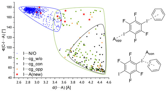 In the blue area, a total of 807 halogen bonds are depicted (583 I···N, 224 I···O). This group is the by far most populated one, which is hardly discernible since most of the points are overlapping. These interactions are the classic strong XBs, which are well-known and obviously often described [32]. Therefore, these interactions are the ones we expected for our systems.