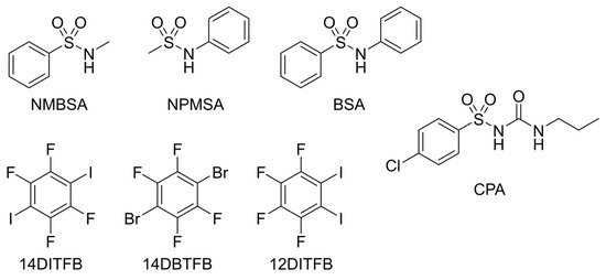 This work presents a series of rationally designed co-crystalline systems of selected sulphonamides with halogen-bonding donors (Scheme 1). Selected survey objects range from the simplest archetypal sulphonamides to their pharmaceutically active derivative CPA. The simplest sulphonamides are N-methylbenzenesulphonamide (NMBSA) [39], N-phenylmethanesulphonamide (NPMSA) [40,41], and N-phenylbenzenesulphonamide (BSA) [42]. They are derivates only substituted by methyl and phenyl moieties, which are nonpolar and sterically manageable. On the other hand, there is Chlorpropamide (CPA) [12], which has been used as an anti-diabetic agent. CPA is more complex and belongs to the sulphonamide subcategory sulphonylureas, which inhibit a urea-like moiety and are used to treat diabetes. It has six polymorphic modifications [43,44] and one known co-crystal with 4,4′-dipyridyl [45]. The coformers, 1,4-diiodotetrafluorobenzene (14DITFB), 1,4-dibromotetrafluorobenzene (14DBTFB), and 1,2-diiodotetrafluorobenzene (12DITFB), are model XB coformers used in various studies to obtain multicomponent systems. Based on the obtained crystal structures, a topological analysis of intermolecular interactions with a primary emphasis on different types of halogen bonding is carried out.