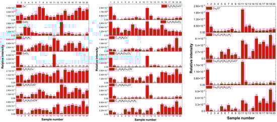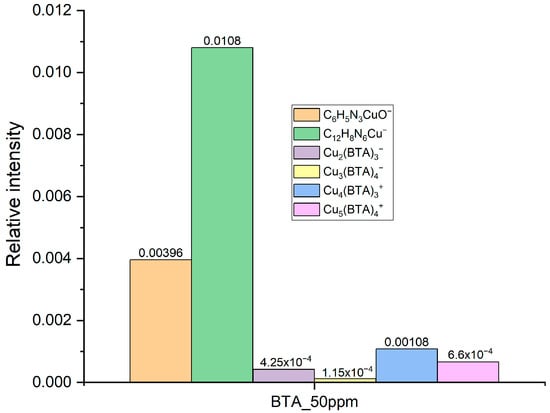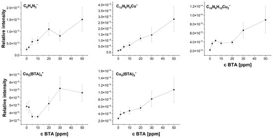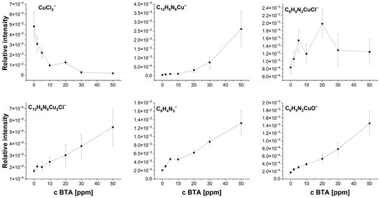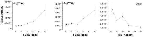 The distribution of the anionic trimeric form Cu2(BTA)3− fluctuates for 2 to 20 ppm of BTA and significantly increases for 30 and 50 ppm. On the other hand, the intensity for the whole BTA concentration is significantly greater than the value observed for the base solution from some impurities. The most linear intensity distribution occurs for the dimeric form C12H8N6Cu−. Only at 50 ppm of BTA is greater intensity observed. However, the linear trend for C12H8N6Cu− may slightly vary depending on applied potential (wire position), as indicated by the standard deviation in Figure 6.
