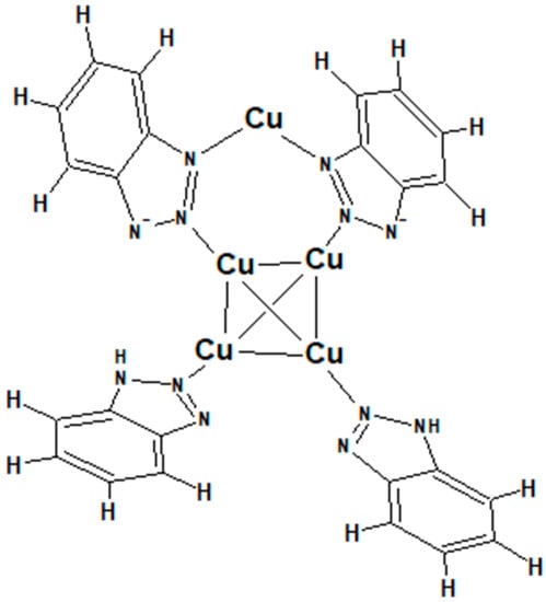 - Liu, J.-J.; Li, Z.-Y.; Yuan, X.; Wang, Y.; Huang, C.-C. A Copper(I) Coordination Polymer Incorporation the Corrosion Inhibitor 1H-Benzotriazole: Poly[Μ3-Benzotriazolato-Κ3N1:N2:N3-Copper(I)]. Acta Crystallogr. Sect. C Struct. Chem. 2014, 70, 599–602. [Google Scholar] [CrossRef]