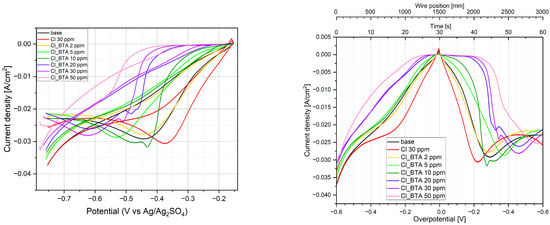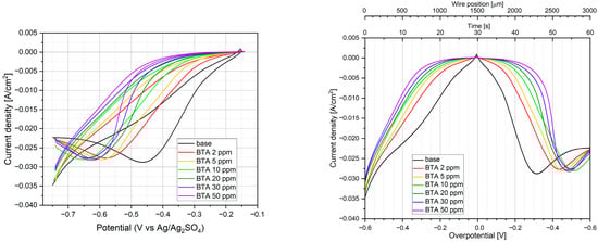 Cyclic voltammetry for base solution and BTA concentrations: 2, 5, 10, 20, 30, and 50 ppm. On the left side, in classical fashion, the right plot shows the wire position, time of electrodeposition, and overpotential. Sweep potential speed: 20 mV/s.
