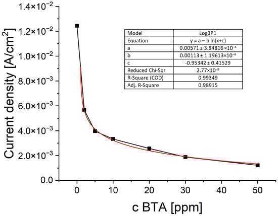 Current density for: 0, 2, 5, 10, 20, 30, and 50 ppm of BTA at wire position 900 µm. It corresponds to the overpotential of −0.25 V for forward scanning (see Figure 3). The red line corresponds to the fitted formula: jc = a − b ln(CBTA + c), where parameters are: a = 0.0057, b = −0.0011, and c = −0.95.