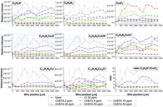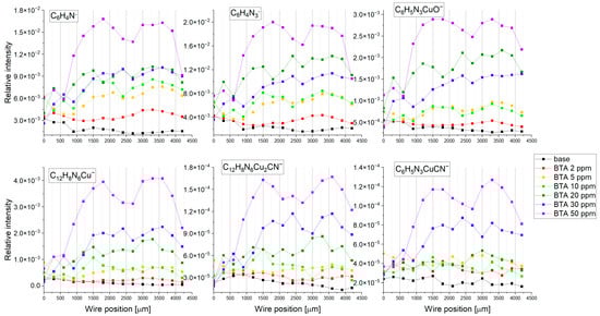 Figure 6 depicts the relationship between intensity and selected fragments as a function of BTA concentration calculated as a mean value of intensity in the cyclic voltammetry region (wire position 0–3000 µm). The standard deviation is related to the deviations of intensity along the wire position (applied potential). The intensity of C6H4N− increases up to 20 ppm. Subsequently, at 30 ppm, the intensity of C6H4N3− decreases, which may suggest greater coverage of dimeric, trimeric, tetrameric, and pentameric forms of BTA, while at 50 ppm, the intensity of C6H4N3− rises, reaching its greatest value.