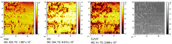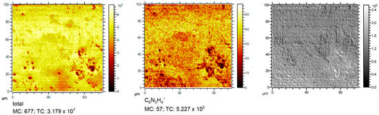 Figure 8 depicts the distribution of the total ion image and selected BTA fragments: CN−, C6H4N3−, and the backscattered secondary electron image. The darker areas in the total ion image correspond to the low amount of BTA (ions CN− and C6H4N3−).
