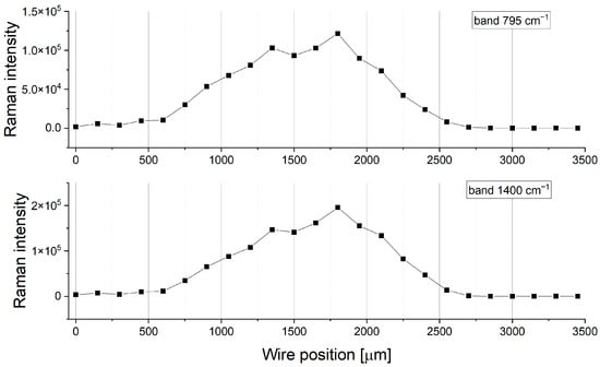 The distribution of Raman intensity is not uniform. A significant Raman intensity enhancement around wire position 1800 µm can be observed. On the other hand, the Raman signal diminishes for reverse scans at or wire positions greater than 1800 µm. To receive the average value of Raman intensity for a selected area of wire, the whole sample area was divided into a smaller area of 150 × 80 µm that contains 270 measured points. Subsequently, the average Raman intensity from all 270 measurement points was calculated for selected peaks. The distribution of average Raman intensity for bands 795 cm−1 and 1395 cm−1 for 30 ppm of BTA is shown in Figure 10.