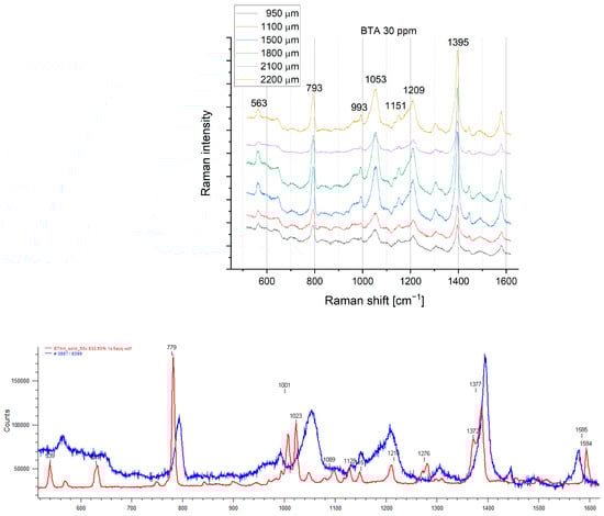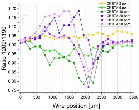 For additional insight into this phenomenon, we evaluated SERS data for BTA at 20 ppm and 50 ppm (Figure S1, Supplementary Materials). For 50 ppm of BTA, the Raman signal is strongly enhanced at the wire position from 0 to 600 µm. Subsequently, from 750 to 1800 µm, it is significantly reduced.