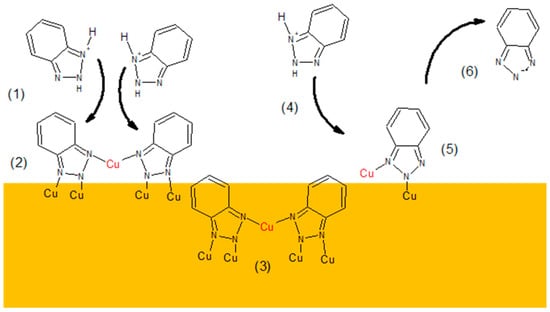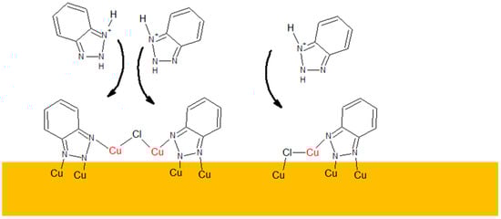 It is widely accepted that the mechanism of inhibiting properties of BTA films on the copper surface is related to the formation of adsorbed molecular species of BTA and Cu(I)BTA complexes. The formation of Cu(I)BTA complexes depends on the pH and potential [43,63,64]. The molecular form of BTA dominates for high-acidity solutions (pH < 1) and for greater (more negative) potentials. The steady-state balance [79] is as follows: