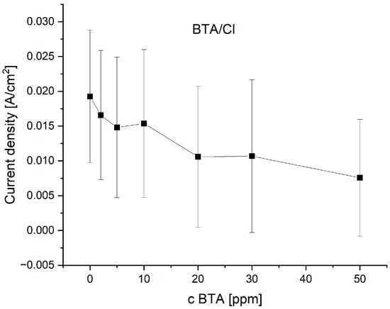 Figure 3 depicts cyclic voltammetry curves for 0, 2, 5, 10, 20, 30, and 50 ppm of BTA in solution containing 0.225 M CuSO4 and 0.56 M H2SO4. For the base electrolyte, during reverse scan, a cathodic peak around −0.25 V (V vs. Ag/Ag2SO4) occurs (Figure 3). It suggests that copper deposition can be controlled by diffusion. After injection of BTA, the cathodic peak is shifted towards more negative potentials for reverse scanning. The greater the BTA concentration, the greater the shift of potential toward a negative value (Figure 3). On the other hand, for forward scanning, the current density is constantly reduced with increasing BTA concentration. It means that BTA acts as a suppressor and increases overpotential during copper electrodeposition. Similar findings were reported previously [20,21,22].