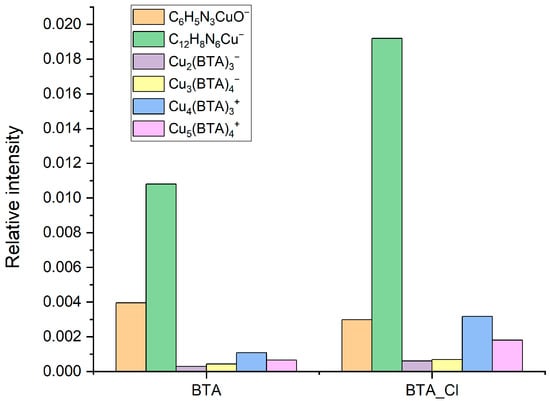 The intensity ratio C12H8N6Cu−/Cu4(BTA)3+ is about 10, while C12H8N6Cu−/C6H4N3CuOH− is about 2.5 (Figure 7). For comparison, the same intensity ratio taken from Figure 2 at wire position 600 µm that corresponds to the current density of −15 mA/cm2 (see CV curve, Figure 3) equals 16 and 0.8, respectively. It means that BTA is incorporated into deposits mainly in dimeric C12H8N6Cu−, trimeric Cu4(BTA)3+, and tetrameric Cu5(BTA)4+. The yield of the monomeric form C6H4N3CuOH− is significantly reduced (16-fold) in comparison to the dimeric form C12H8N6Cu− identified on the copper surface obtained in the CV experiment. Moreover, the contribution of the incorporated C12H8N6Cu− form in comparison to the polymeric form Cu4(BTA)3+ is also slightly greater.