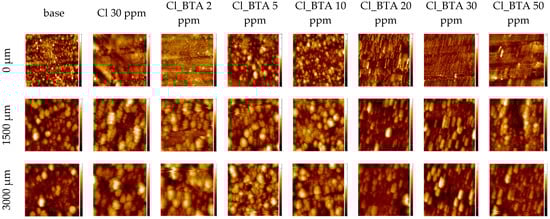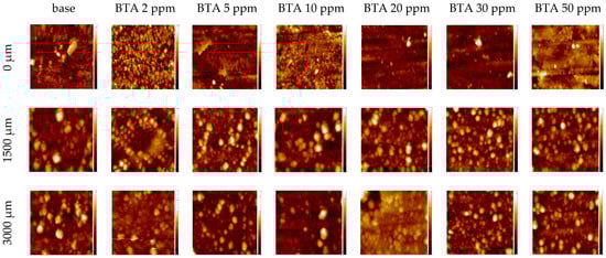 Backscattered secondary electron images (right image) show that crystals are built in areas with very low BTA surface coverage. It directly shows the inhibition properties of BTA in suppressing copper crystal size formation at the microscale. An investigation of the influence of BTA on surface morphology at the nanoscale for all BTA concentrations was examined by AFM (results and discussion in Section 2.11).