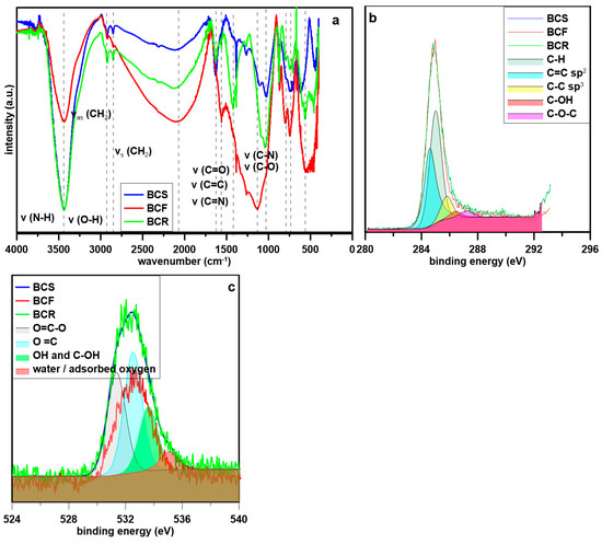 Figure 1. The spectroscopic analysis of tested materials: (a) FTIR spectra, (b) XPS C peak, and (c) XPS O peak.