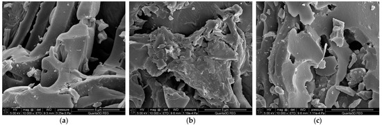 Figure 2. SEM images of tested materials: (a) BCS, (b) BCF, and (c) BCR.