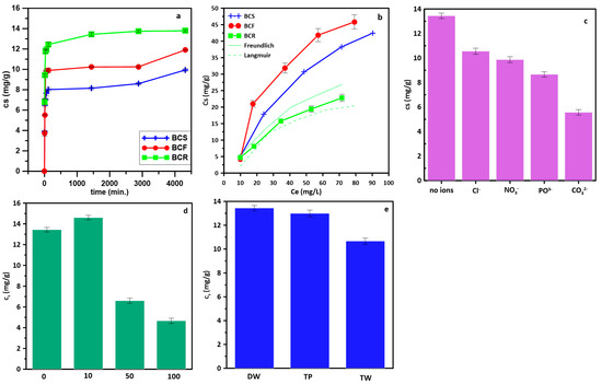 Figure 3. Adsorption studies of NTZ onto tested BC: (a) kinetics cNTZ = 20 mg/L mBC = 100 mg; (b) CNTZ = 10–100 mg/L, mBC = 100 mg; (c) effect of inorganic ions cion = 0.005 M; (d) effect of dissolved organic matter, cTA = 10–100 mg/L; (e) effect of water matrix: DW—distilled water, TP—tap water, TW—treated wastewater.