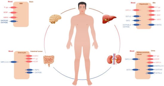Transporters are a ubiquitous class of proteins that are located on the cell membrane and facilitate transport functions throughout the human body (Figure 1). Until now, it has been generally assumed that multispecific drug transporters are derived from two transporter superfamilies: the ABC superfamily and the SLC superfamily. ABC transporters are a family of efflux transporters that transport drugs and endogenous substances by reversing the energy concentration gradient after ATP hydrolysis and are related to drug bioavailability, tumor multidrug resistance, and disease. Among the ABC family members, P-glycoprotein (P-gp), multidrug resistance-associated protein (MRP), and breast cancer resistance protein (BCRP) are considered to be important causes of multidrug resistance (MDR) of tumor cells [] and therefore are the most studied subtypes related to drug transport. In addition, there are bile salt transporters (BSEP). Bile salt transporters that are not functioning properly or are expressed abnormally have been identified as significant factors contributing to various liver diseases, particularly those causing cholestasis []. Most SLC transporters are located on the cell membrane and rely on electrochemical and ion concentration gradients to transport substrates, regulate the exchange of soluble molecular substrates between the two sides of the lipid membrane, and maintain the stability of the intracellular environment. Over 400 transporters have been identified to date, displaying a wide range of substrates such as sugars, amino acids, vitamins, nucleotides, metals, inorganic ions, organic anions, oligopeptides, and drugs []. The SLC22 transporter family is among the most extensively researched SLC families in terms of drug handling [], playing a central role in the transport of small molecule endogenous substances, drugs, and endotoxins across tissues and interfacial fluids. SLC transporters involved in drug transport are primarily composed of organic anion transporters (OATPs), organic anion transporters (OATs), organic cation transporters (OCTs), and oligopeptide transporters (PEPTs). Another SLC transporter, the multidrug and toxic compound efflux transporter (MATE), is an efflux transporter. Transporters expressed in the intestine, liver, and kidney play a critical role in the drug absorption, distribution, metabolism, and excretion (ADME) process. These transporters play a crucial role in regulating drug concentrations in both blood and tissues. Oral medication is primarily absorbed in the gastrointestinal tract, and its bioavailability is influenced by both uptake and efflux transporters present in this region. PEPT1, a transport protein expressed on the brush border membrane of the intestine, facilitates the absorption and transportation of peptide-like anticancer drugs within the gut. Linking the drug with a dipeptide can improve its bioavailability in the human body []. P-gp is the most extensively studied efflux transporter and plays a crucial role in limiting the bioavailability of numerous orally administered drugs []. MRP2 and BCRP are also expressed in the intestinal tract, with known substrates including statins, methotrexate, and other compounds. Transporters play a significant role in drug tissue distribution and elimination, ultimately influencing drug selectivity. Within the blood–brain barrier (BBB), various transport proteins, including P-gp, BCRP, and OCTs, play crucial roles in the distribution of neuroactive drugs. These transport proteins regulate the velocity and direction of drug transportation across the BBB. P-gp and BCRP can collaborate to facilitate the transportation of chemotherapy drugs [].