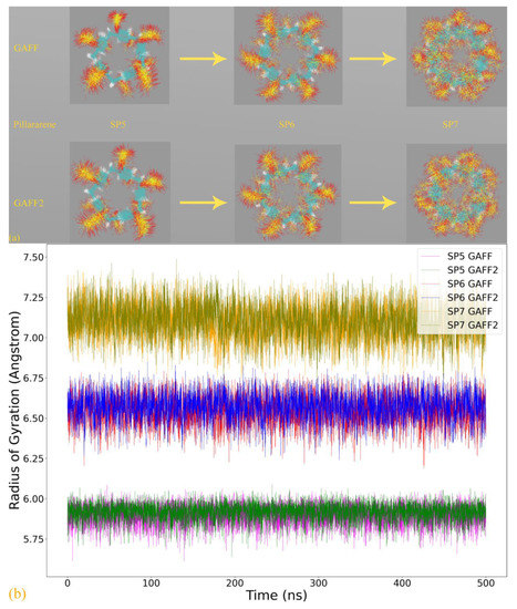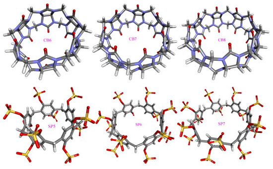 The second host family we study is pillar[n]arene. Unlike the previous CB[n] family that is better studied and applied in much pharmaceutical research, pillararenes are relatively unpopular and seldom studied in a detailed manner computationally. The modeling reports on host–guest binding affinities in the recent SAMPL9 challenge serve as a good addition to the literature [12,50,51,52], but the dynamic behaviors of this host family are still to be revealed. Due to the low water-solubility of the prototypical form, pillararenes are mostly applied with chemical modifications. For instance, the carboxylated form featuring -CH2COO− has enhanced solubility, strong drug-binding ability, and easy functionalization and thus serves as a promising candidate in drug delivery [53,54,55,56,57]. As this modification has been covered in our recent end-point series on the SAMPL9 dataset involving the 6-membered species [50,51,52], in the current work, we consider another chemically modified pillararene series with -SO32− tails on the symmetrical rims. These host series are thus named SPn in the following discussion. The 6- and 7-unit members have intermediate cavity volume and entrance size, although the 5-unit macrocycle also has the ability to encapsulate drug-like molecules.