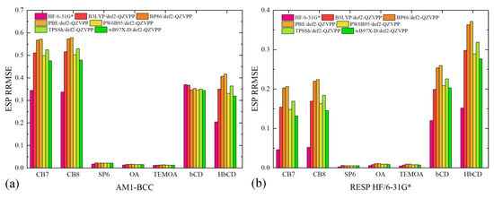 As discussed above, the ultimate goal in charge fitting is to reproduce molecular ESP rather than any specific charge distribution. Thus, the quality of ESP reproduction serves as a crucial factor in the evaluation of charge quality. The charge-generated molecular ESP is compared with the fitting target (i.e., HF/6-31G* ESP), and the error is quantified by a commonly used metric named relative root-mean-squared error (RRMSE). Aside from the traditional HF/6-31G* level for ESP scan, we also consider many other modern options, including B3LYP [22,23,24], BP86 [25,26], PBE [27], PW6B95 [28], TPSSh [29,30], and wB97X-D [31], all of which are combined with a rather upgraded huge basis set def2-QZVPP [32,33], due to many criticisms on the use of the ‘crude’ traditional HF/6-31G*. The resulting def2-QZVPP-combined ab initio levels are very costly even with modern computing resources, especially for huge molecules like macrocyclic hosts considered in the current work. Therefore, the high-level huge-basis-set results serve as a practically converged fitting target in host parametrization and benchmarking reference in quality evaluation.