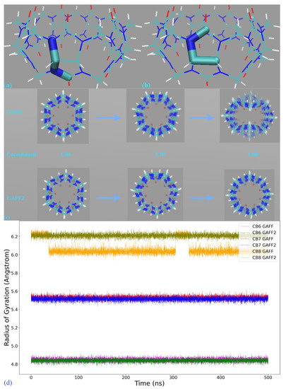 After obtaining a term-specific understanding of the similarities and differences of GAFF derivatives, we then perform 500 ns unbiased simulations in explicit water to probe the dynamics of the host molecules. For this simulation, we use GROMACS 2020.6 [45], the velocity rescaling algorithm [46] for temperature regulation at 300 K and the Parrinello–Rahman barostat [47,48] for pressure regulation at 1 atm, a time step of 1 fs, smooth particle-mesh Ewald [49] for long-range electrostatics. The host structures are superposed with 500 ps per snapshot for clarity in Figure 3c. Through the GAFF-vs-GAFF2 comparison of host dynamics, an interesting phenomenon is observed. For the 6-unit cycle CB6, the host dynamics under GAFF and GAFF2 are almost the same. The host remains in the opened-cavity state in the whole 500 ns sampling. When the number of repeating units increases to seven (i.e., CB7), there is still no noticeable difference between GAFF and GAFF2 dynamics. Interestingly, when the number of repeating units increases further to the eight-unit member CB8, the host dynamics begin to exhibit noticeable differences under the two GAFF derivatives. The GAFF host interconverts between the fully opened state and the squashed state periodically, while under GAFF2, the host remains in the open state. Similar conclusions could also be reached from the time series of the radius of gyration (Rg) shown in Figure 3d, where the GAFF and GAFF2 curves are similar for CB6 and CB7 but exhibit noticeable differences for CB8.