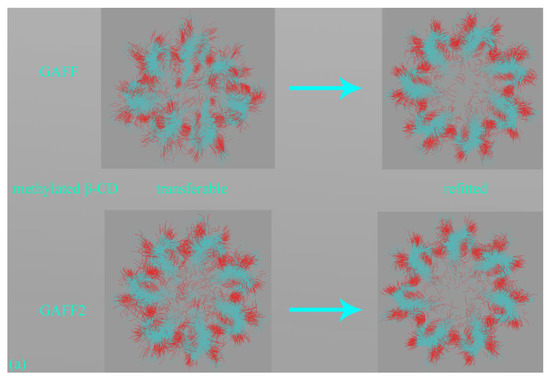 Overall, the detailed investigation of the methylated β-CD ring provides insights into the similarities and differences of transferable GAFF derivatives, their closeness to high-level descriptions, their room for improvements, and the dynamic behaviors of pre-fitted and refitted force fields. When accurate descriptions of the host dynamics are pursued, force field refitting seems necessary. However, as this requires costly ab initio calculations if the practitioners insist on employing transferable force fields, the GAFF2 option could be recommended, considering its proven successes in host dynamics and binding thermodynamics for the prototype β-CD reported in our previous work [7] and its close-to-ab-initio behavior for chemically modified β-CD reported in the current work.