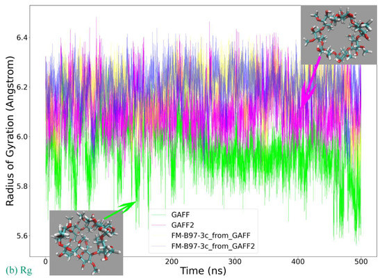 According to the structural overlay in Figure 8a, the host cavity is twisted and stays in a squashed state under GAFF. This conclusion could be more evident according to the GAFF snapshot with explicit hydrogen presentation at the small Rg configuration presented in Figure 8b. Under GAFF2, the host dynamics are more regular, and the host cavity seems stiffer, which agrees with the observations in the prototype β-CD reported in our previous work [7]. However, the substituting methyl groups are still invading the entrance region with a non-negligible probability, which is somehow similar to GAFF. It should be noted that this conformation (i.e., the occupancy of the cavity entrance by the substituting methyl groups) should be differentiated from the squashed state where the host cavity is squeezed, as the latter is caused solely by backbone motions, while the former involves both backbone motions and the rotational dynamics of the methyl rims. Unlike the transferable parameter sets, the refitted force field FM-B97-3c, regardless of the initial guess and restraint reference, produces an even more regular dynamic behavior compared with GAFF2. The FM-B97-3c host cavity is fully opened during the course of 500 ns unbiased sampling, and the substituting groups seldom visit the entrance region. These two refitted force fields are thus producing the stiffest description of the Hβ-CD cavity in this work. As the refitted force fields are energetically closer to ab initio calculations (higher reliability) and the host dynamics produced by them are initial-guess-independent, their host dynamics should be close-to-ab initio and of the highest reliability. Therefore, none of the popular GAFF derivatives could be satisfactory for the substituted CD rings, and force field refitting with costly ab initio calculations seems necessary to accurately describe the host dynamics. From the Rg time series presented in Figure 8b, the similarity of the refitted force fields could still be observed. The GAFF curve is systematically lower than the other, and the GAFF2 curve is closer to FM-B97-3c results, but still, some deviations could be observed. Thus, similar conclusions could be obtained according to the Rg time series.
