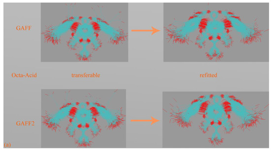 The above numerical data of energetics and atomic forces provide valuable information about the closeness of transferable parameter sets to high-level reference and successfully locate the problematic terms. We then perform 500 ns unbiased explicit-solvent sampling of the solvated host under the refitted parameter sets in order to probe whether the pronounced energetic and force betterments would lead to noticeable differences in host dynamics. The host structures are superposed in Figure S4a,b for the two FM-B97-3c force fields refitted from GAFF and GAFF2. By comparing the structural overlays of the two refitted force fields, we do not identify significant differences. Likewise, the FM-B97-3c dynamics in Figure S4a,b are also similar to those under the initial guesses GAFF(2) in Figure 6a. The time series of the radius of gyration and the refitted force fields are also compared with those under the initial guesses in Figure S4c, where the four parameter sets share similar behaviors. Therefore, despite the significant problems in bond-stretching potentials (and also minor problems in angle-bending and vdW terms), the dynamic behavior of the sulfur-substituted pillararene family could be accurately described with transferable GAFF derivatives. Practically, no significant difference exists between host dynamics produced by GAFF and GAFF2, and picking either option seems fine, although energetically, GAFF is slightly better than GAFF2. However, it should be noted that when bond-length-related observables or in situations where accurate energetics are crucial (e.g., reweighting between force field descriptions and ab initio levels) [58,59,60,61], the pre-fitted GAFF derivatives could be non-satisfactory and refitted force fields could be necessary.