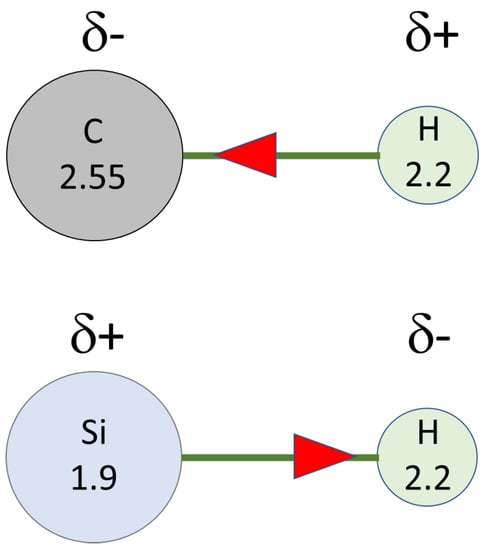 As mentioned earlier, the backbone of silicone materials consists of silicon and oxygen atoms (Figure 1). Silicon is the neighbor of carbon in the same XIV group in the periodic table, which is the reason for many similarities of these elements. However, silicon is more electropositive than carbon. According to the Pauling scale, silicon has an electronegativity (χ) of 1.90, while carbon has a χ of 2.55. Between them is hydrogen with a χ of 2.20. This means that the Si-H bond is polarized in the opposite direction of the C-H bond (Figure 2). Therefore, a Lewis acid can pick up hydrogen as a hydride ion from silicon.