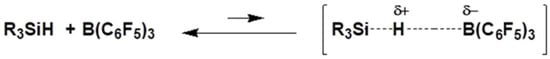 The Piers–Rubinsztajn reaction has a similar mechanism to the reduction and silylation of organic compounds [14]. It is therefore instructive to show the mechanistic features of these previously studied reactions, such as the reduction of carbonyl compounds by a SiH-containing reagent catalyzed by TPFPB. Extensive spectroscopic and computational evidence supported by kinetic studies showed that the first step in these reactions is the formation of an adduct of the Si-H reagent with the borane (Scheme 2) [10,11,35].