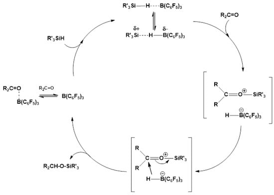 The common mechanism of carbonyl reduction assumes that the positive silicon in the borane-HSi complex is attacked by a nucleophile like a carbonyl (Scheme 3). This idea is backed up by studies using stereogenic silane, which proved that the reaction is a bimolecular synchronous substitution of the SN2 type at silicon [40].
