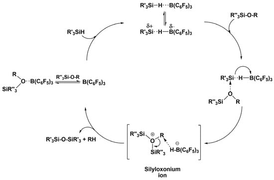 Nucleophilic substitution on the silicon concerting with the hydride transfer to carbon cannot be ruled out. However, computational studies showed the minimum of free enthalpy on the reaction pathway for the siloxonium ion [42]. The existence of the silyloxonium ion was proved experimentally [42,43]. The HB(C6F5)3− counter-ion is a known species; see, for example, [44].