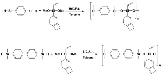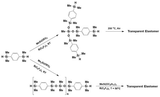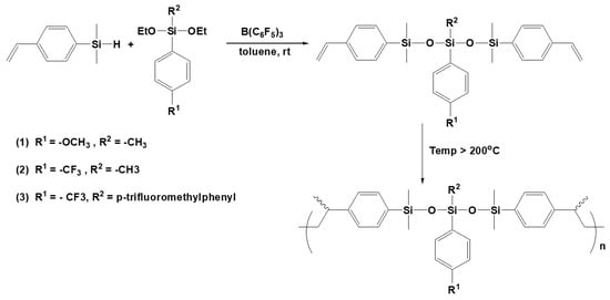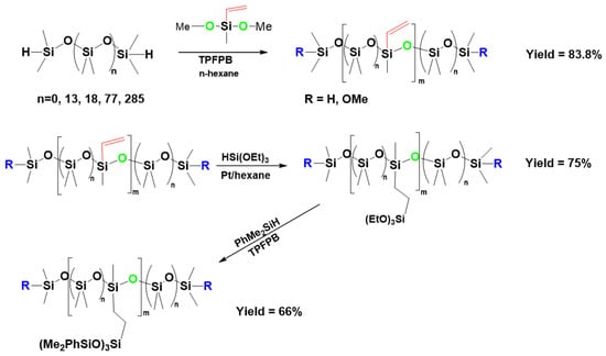 - Yi, M.; Chen, X.; Wu, S.; Ge, J.; Zhou, X.; Yin, G. Fabrication of Reactive Poly(Phenyl-Substituted Siloxanes/Silsesquioxanes) with Si–H and Alkoxy Functional Groups via the Piers–Rubinsztajn Reaction. Polymers 2018, 10, 1006. [Google Scholar] [CrossRef] [PubMed]
