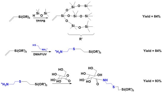 Vinyl-functionalized oligosiloxanes were prepared with the P-R reaction between pentamethyldisiloxane or 1,1,1,3,5,5,5-heptamethyltrisiloxane and vinyltriethoxysilane to produce corresponding tris(trioligosiloxy)vinyl silanes [65]. These oligosiloxanes were further functionalized with cysteamine to form aminoalkyl branched siloxanes. The presence of an aminoalkyl group allowed for their subsequent modification with various sugar lactones to obtain silicone surfactants of a natural origin (Scheme 8).