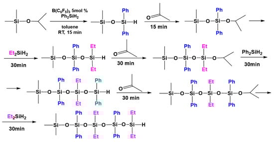 Sato et al. reported a creative approach to the synthesis of well-defined siloxane oligomers with a sequence-specific structure. They developed a simple one-pot process by combining two reactions catalyzed by TPFPB: the hydrosilylation of the carbonyl group of a simple ketone or aldehyde using a dihydrosilane (such as Et2SiH2) with the P-R condensation of the formed oligosiloxane with a terminal isopropoxy group with another dihydrosilane molecule (such as Ph2SiH2) [69]. A typical example of such a sequential methodology is shown in Scheme 10, where, starting from isopropoxytrimethylsilane, a linear pentasiloxane with alternating Ph2SiO and Et2SiO units was prepared in seven steps over 3 h with a final yield of 70%. The synthesis of well-defined branched and cyclic oligosiloxanes was also demonstrated using the same one-pot procedure. The authors anticipate the use of this methodology to obtain silicone materials with precisely tuned physical properties. The same group reported another one-pot synthesis of well-defined trisiloxanes by combining the iridium-complex-catalyzed hydrosilylation of an organosilyl acetate using dihydrosilanes to disilyl acetals with the TPFPB-catalyzed rearrangement of this compound to an ethoxy-functional disiloxane followed by the PR condensation of the formed disiloxane with another dihydrosilane molecule [70].