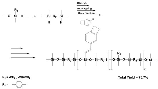 The P-R reaction was used to obtain polysiloxanes functionalized with thermolabile groups, making it possible to obtain thermosetting resins that can be cured at elevated temperatures. The synthesis of a linear siloxane prepolymer of vinyl-functionalized curable resins was carried out with the P-R condensation method followed by the addition of thermo-curable benzocyclobutene groups (BCB) with the Heck reaction (Scheme 11) [71].
